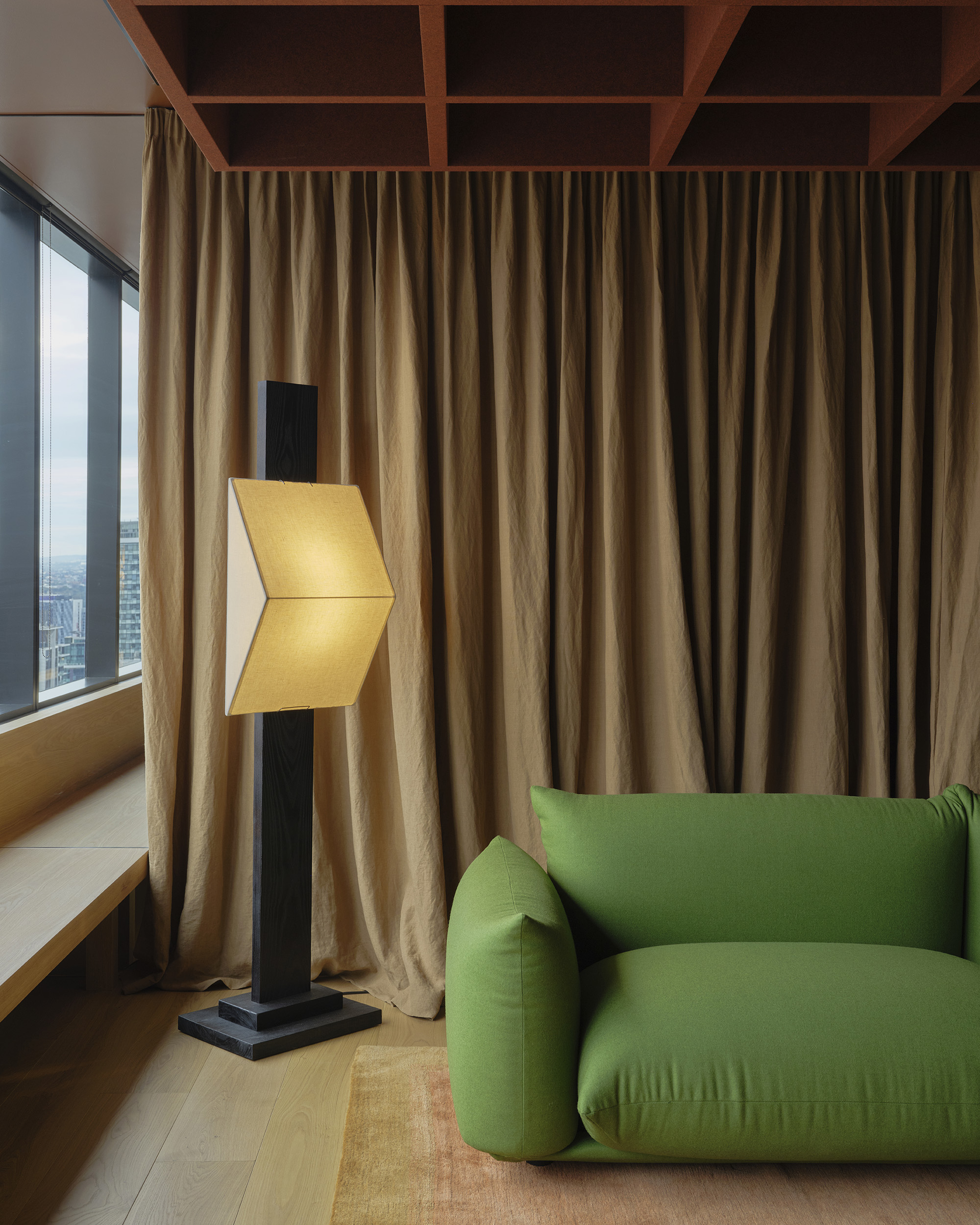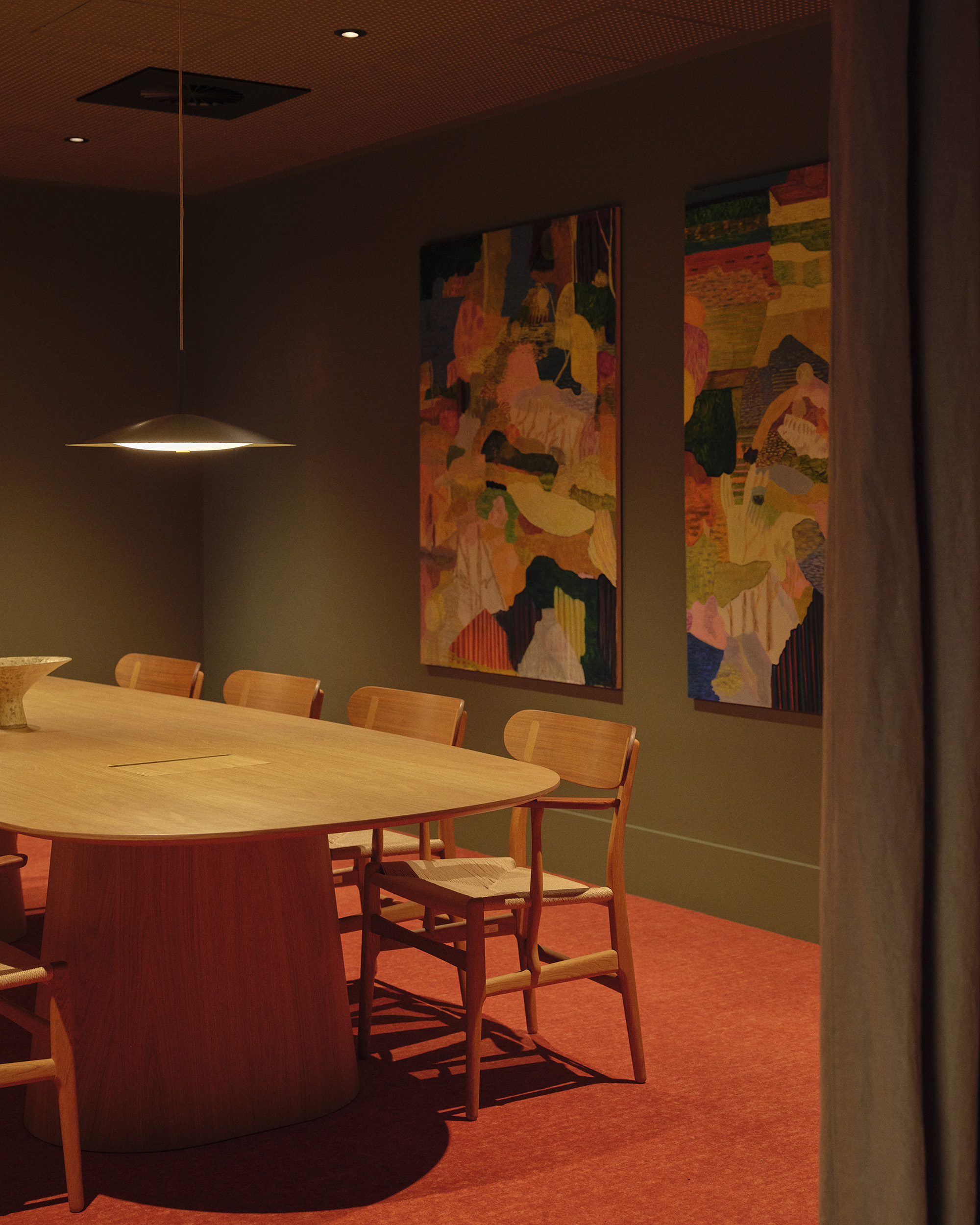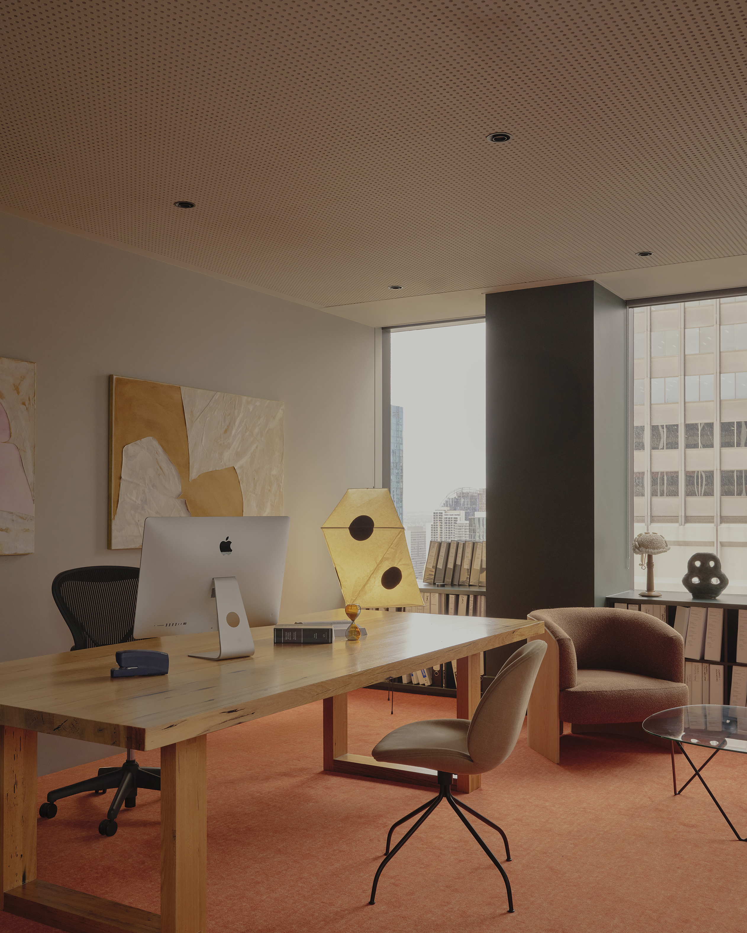 Our approach was to soften the corporate edge of the overall space, to step away from the conventional projection of the law as expensive, prestigious and stuffy and to make a space which could provide calm, softness and even a sense of refuge. Manipulating the immutable requirements of building owner requirements, regulations, acoustic performance and technical infrastructure, we sought to represent difference through a warm and textural material palette and public spaces which afford privacy, natural light penetration and domestic comfort.