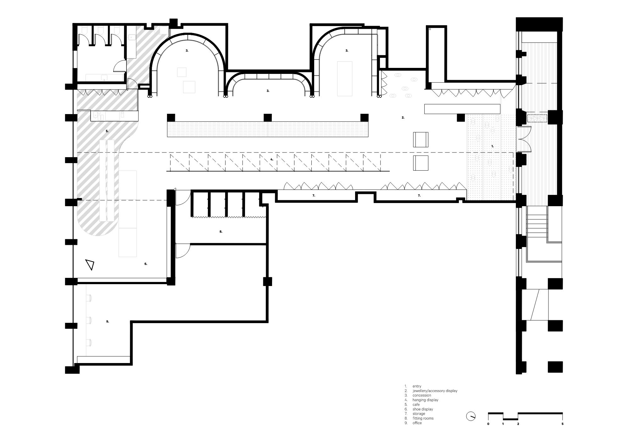 Upon entering, the customer is greeted by a flight of three steps with a tactile surface, signalling the entry into another state by altering the sensation underfoot, and delivering them to the soft floor plane of carpet. From there, they move through a gathering of suspended bust forms and emerge into the store proper.