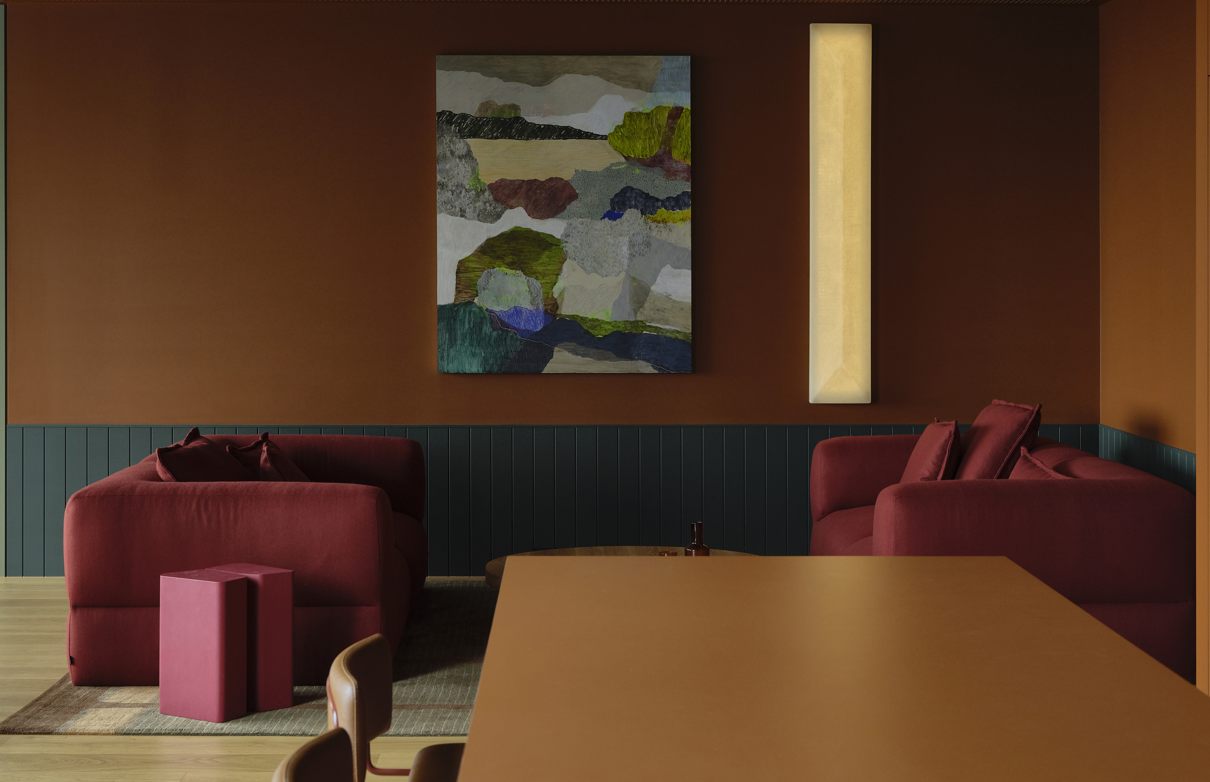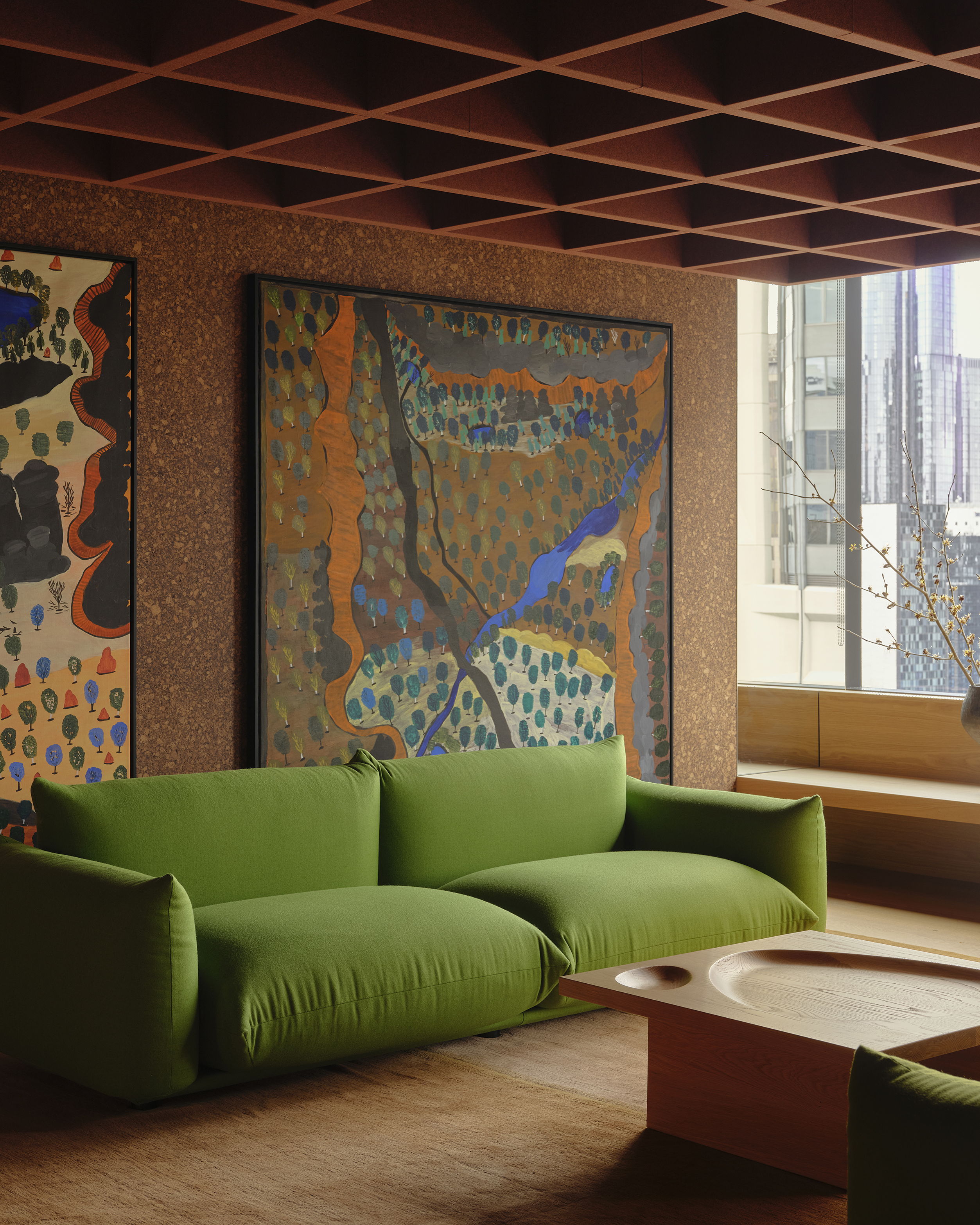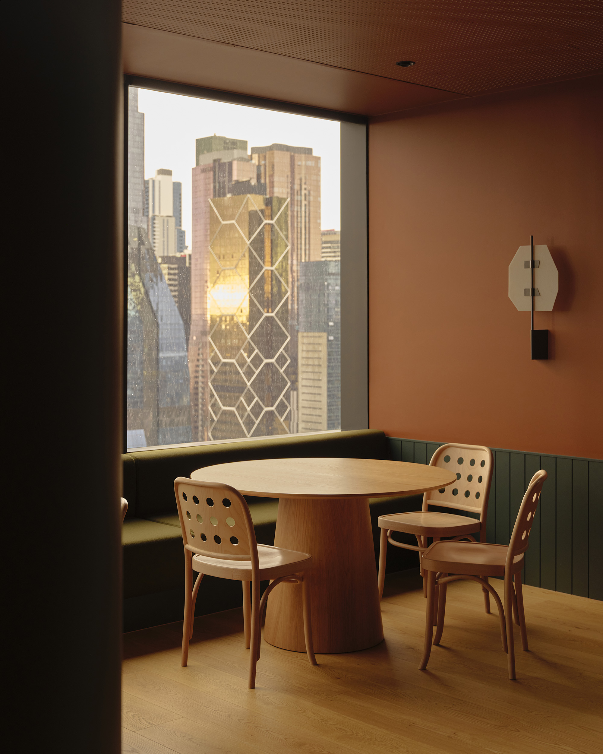 Our approach was to soften the corporate edge of the overall space, to step away from the conventional projection of the law as expensive, prestigious and stuffy and to make a space which could provide calm, softness and even a sense of refuge. Manipulating the immutable requirements of building owner requirements, regulations, acoustic performance and technical infrastructure, we sought to represent difference through a warm and textural material palette and public spaces which afford privacy, natural light penetration and domestic comfort.