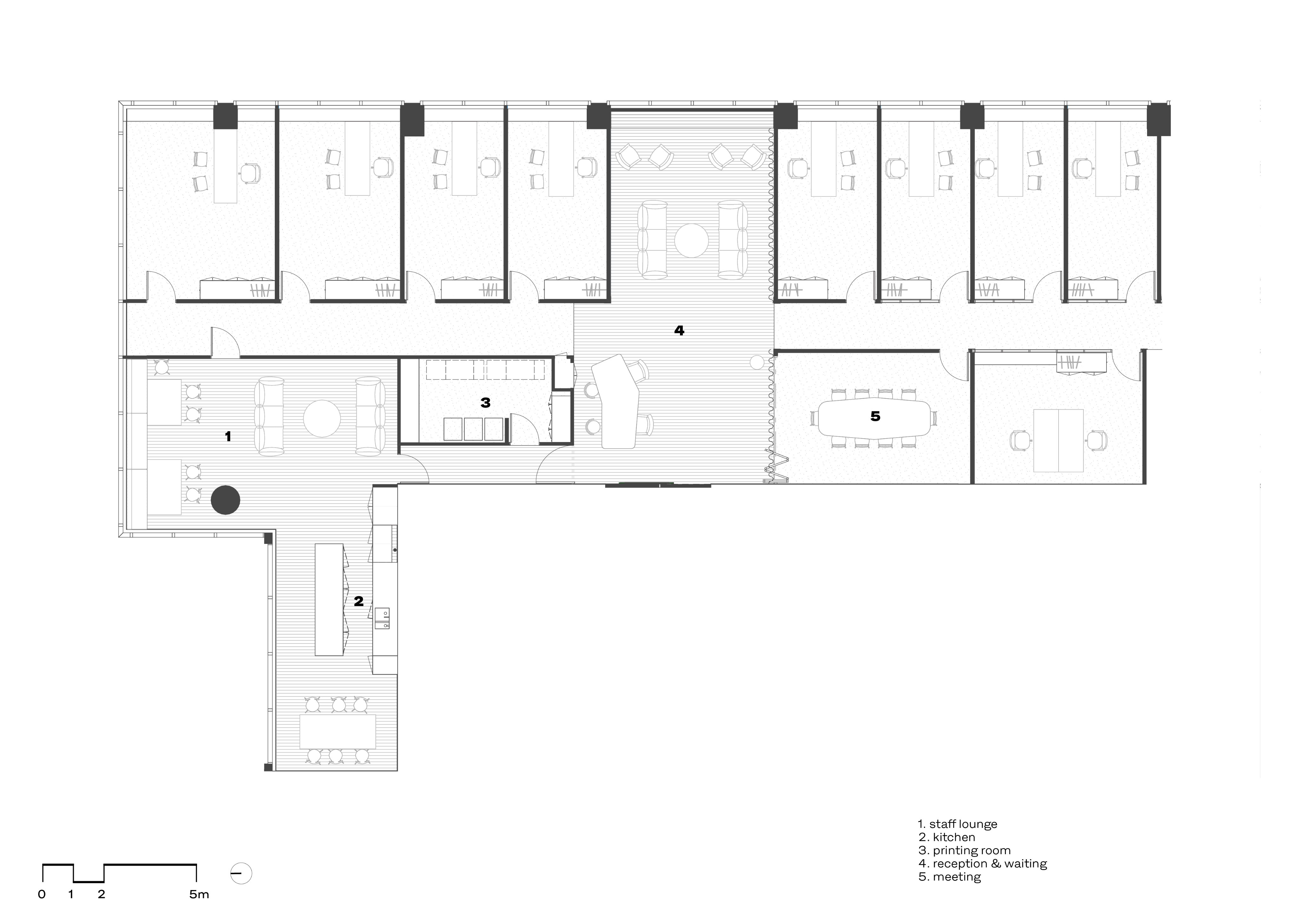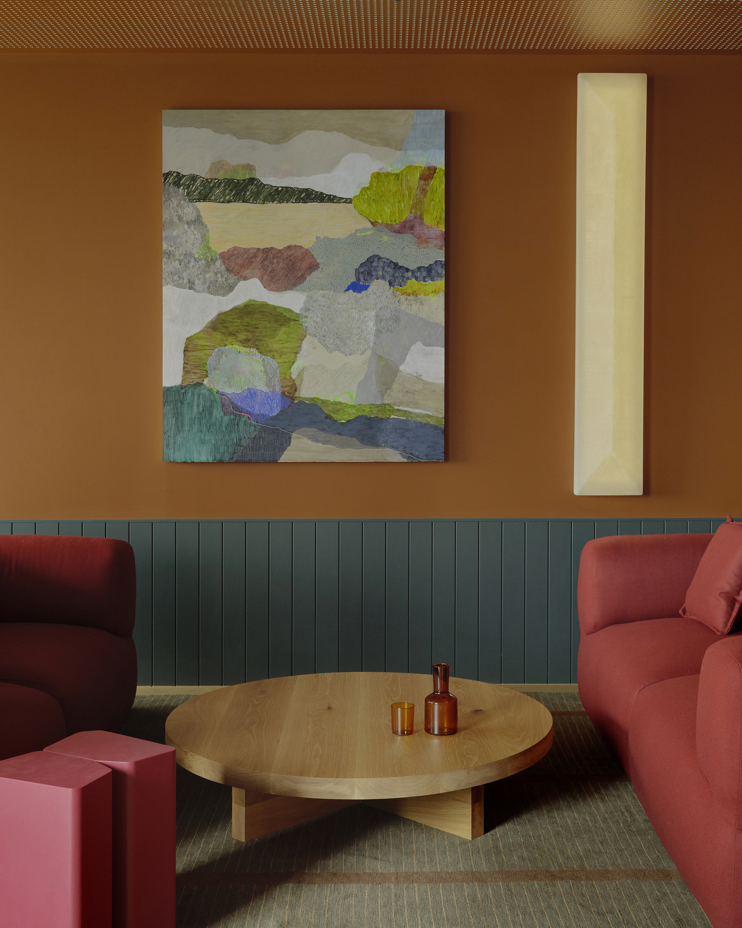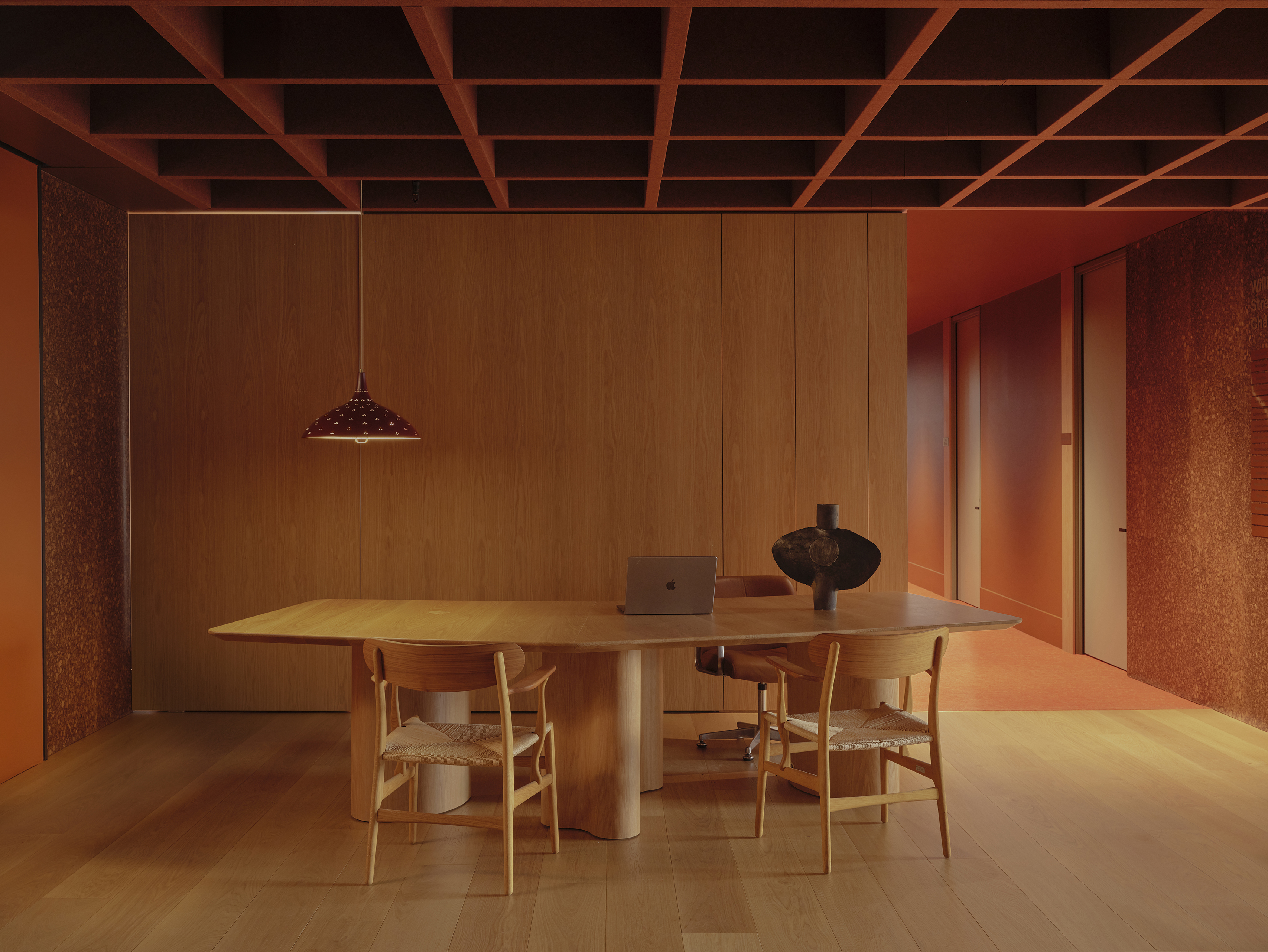 Our approach was to soften the corporate edge of the overall space, to step away from the conventional projection of the law as expensive, prestigious and stuffy and to make a space which could provide calm, softness and even a sense of refuge. Manipulating the immutable requirements of building owner requirements, regulations, acoustic performance and technical infrastructure, we sought to represent difference through a warm and textural material palette and public spaces which afford privacy, natural light penetration and domestic comfort.