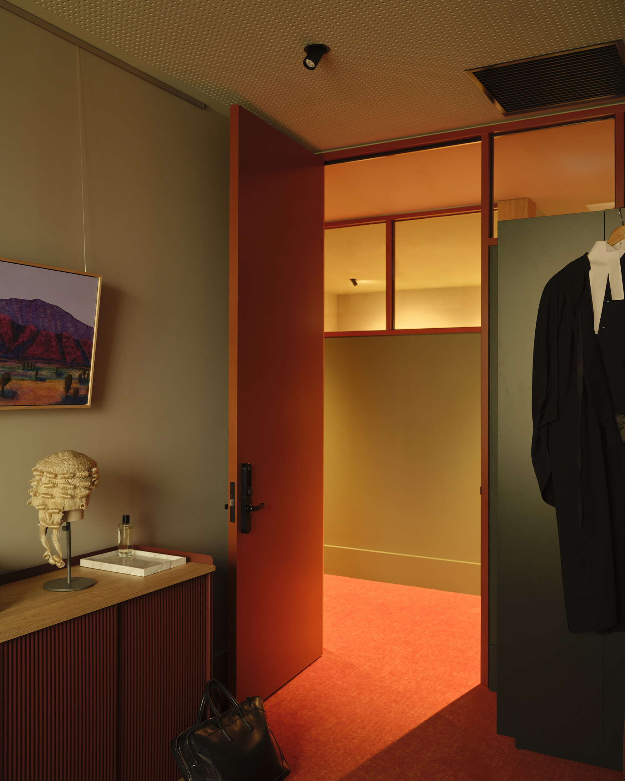 Essential to the design outcome was to ensure that individual chambers would be capable of customization acknowledging the unique nature of Barrister’s Chambers as a collective of allied individuals rather than a singular corporate identity. Visually and acoustically, the chambers are reminiscent of domestic settings in recognition of the need for comfort during often very long hours of work. The public and shared areas however, needed to be cohesive and reflect a consistent aesthetic and experiential quality reflecting the shared values of the Barristers who came together to form the Chambers. These values included an important aspiration for the project - to make an environment sensitive to the often extremely stressful situations that many of the Barristers’ clients face, including significant fines or prison sentences. To meet this need, we were careful to avoid cues or symbols of institutional, corporate or legal settings, and focused on making the spaces quiet, soft, private and natural. They are dignified, but not intimidating.